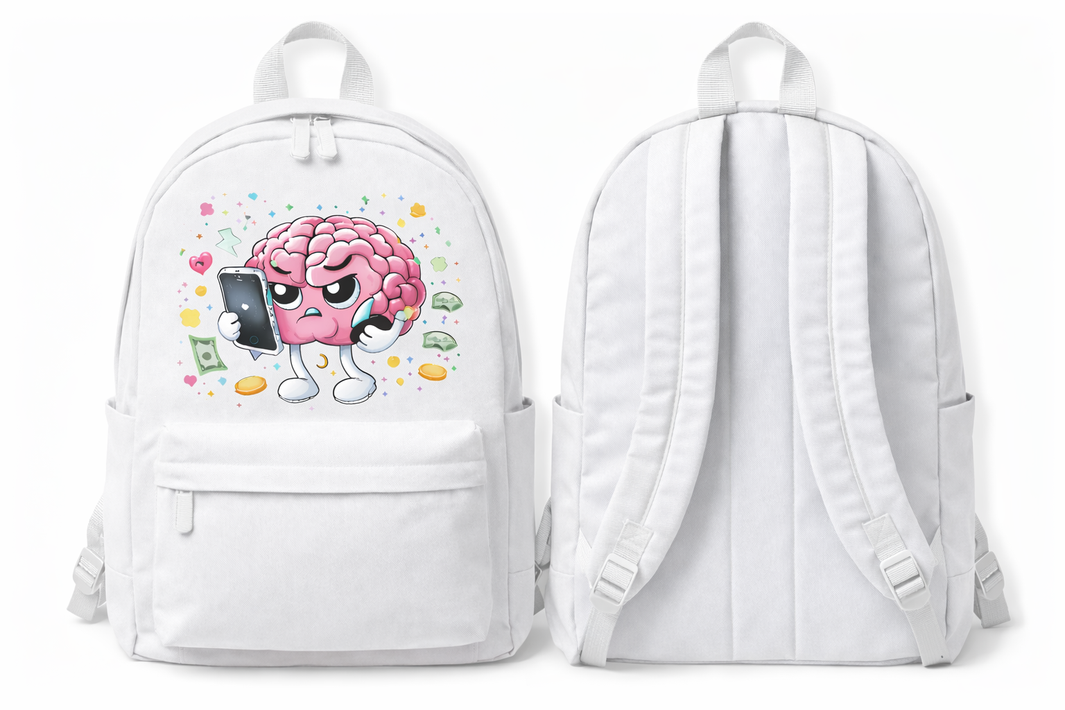 The Backpack is designed for thinkers, dreamers, on-the-go, and creatives who carry more than just essentials. Featuring a bold brain graphic that captures mental overload in a playful, emotional way, this backpack makes a statement without saying a word.